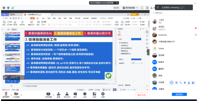 袁颖以《一堂优秀的微课》为主题,分别从“微课拍摄课程布局、微课拍摄准备工作、微课拍摄过程”三个维度做精彩分享。她以亲身录课体验,实现一堂优秀微课为案例,重点介绍借用现代信息技术,把握线上教与学的规律,将碎片化学习内容、过程及扩展素材等构建为结构化的数字资源。