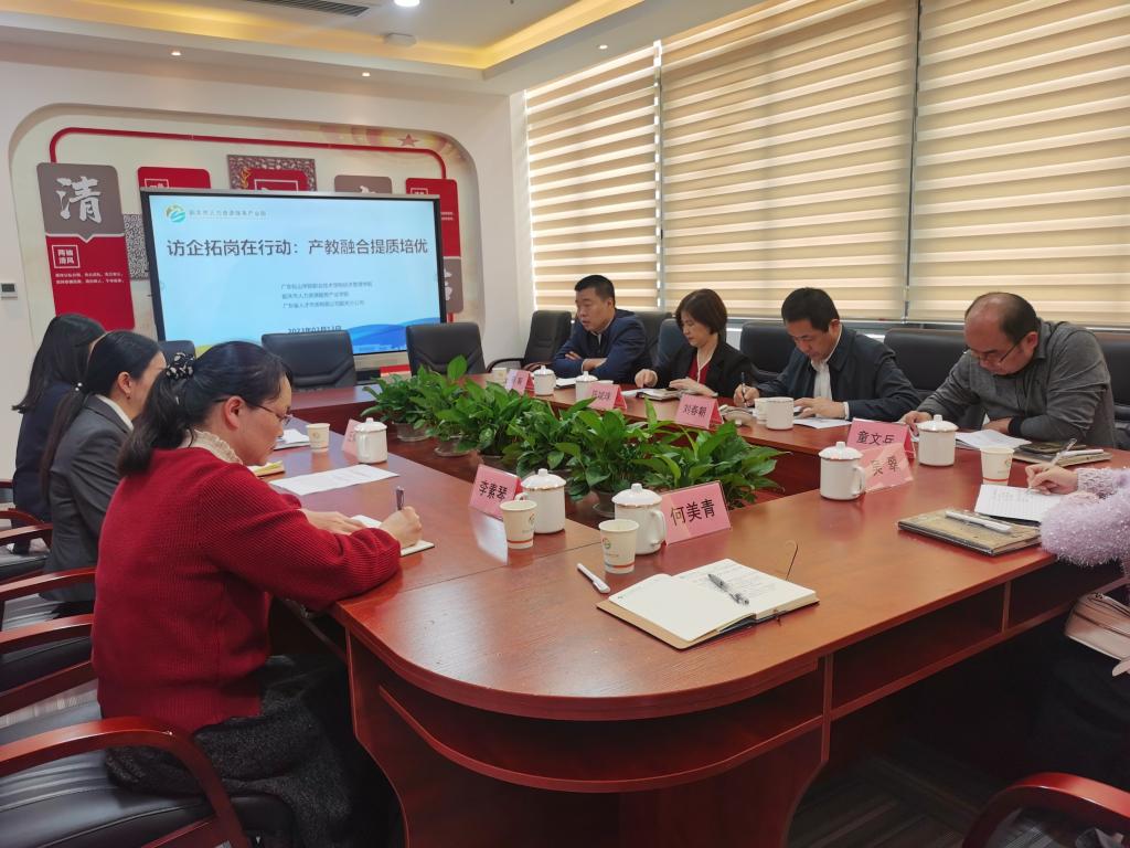 调研交流会上,丘婷婷介绍了产业园业务结构、日常运营情况和未来规划,表达了企业对人才的渴求,提出了增强校企双方在人力资源数字化开发方面的合作意愿。刘春朝介绍了双方合作共建韶关市人力资源服务产业公司、人才共培等情况,提出双方要进一步加强沟通,扩大合作空间,挖掘产教融合深度,提升合作质量,精准培养企业急需人才。陈斌珠表示,希望进一步探索党建引领专业高质量发展、促进员工高质量就业的方式方法,走出一条“党建+业务”“党建+团建”“党建+志愿服务”助推人力资源管理专业产教融合提质培优的创新之路。