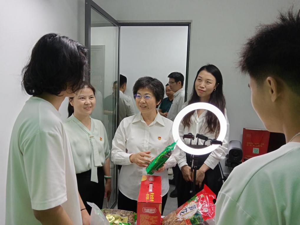 联学交流活动结束后,陈斌珠陪同黄苑芳一行参观了数字经济产教融合公共实训基地,观看了员工在选品展示与直播运营实训室直播销售韶关农特产品的情况,并与刚刚下播的员工进行了亲切交谈。
