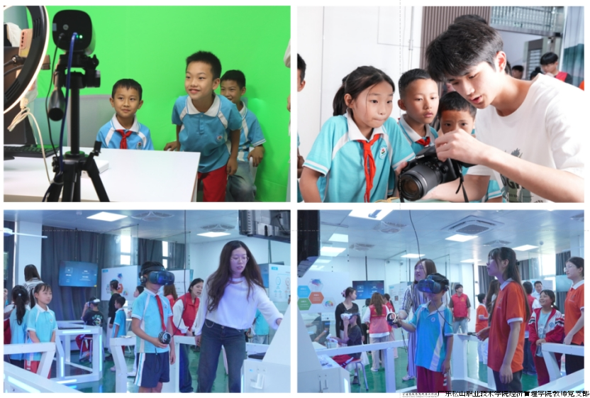 讲座结束后,参加研学活动的小员工们分成3个小组,轮流到数字商品数字采编实训室、选品展示与直播运营实训室、数字人力资源实训室等实训室,在电子商务、市场营销、人力资源管理等专业党员志愿者的引导下,观摩和体验了摄影、视频制作与剪辑、短视频制作、直播销售等数字经济相关工作实操,并戴上VR眼镜体验了职场成长元宇宙评估虚拟场景。