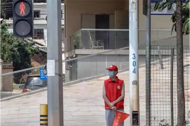志愿者进行交通引导,穿戴志愿者服饰,手拿一杆小红旗,耐心劝导来来往往过路的行人,过马路一定要走斑马线,绿灯亮了才可通过。